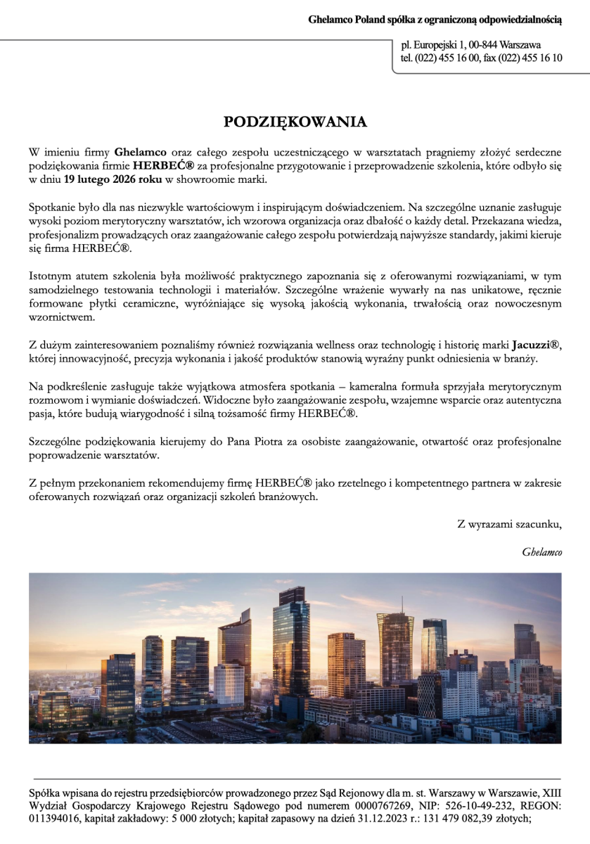 W dniu 19 lutego 2026 dla firmy Ghelamco zrealizowaliśmy Kameralne Warsztaty w naszym Showroom-ie HERBEC® Warszawa.